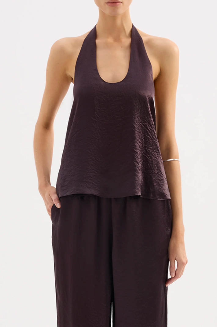 The Ana Halter Top is made from a premium crushed satin featuring a luminous, gloss finish and subtle crinkle texture. The silhouette is a halter neck with a low back. Features include low scooped neckline with thin neck ties and elastic, gathered detail at back.