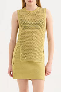 The Marlo Knit Top is made from a viscose blend yarn, with a cool hand feel and an open knit construction. The silhouette is a slim fitting, long line tank shape with length finishing below the hip. Features include a crew neck, angled side seams with splits, a stepped hem and rib construction around neckline, armhole and hem.