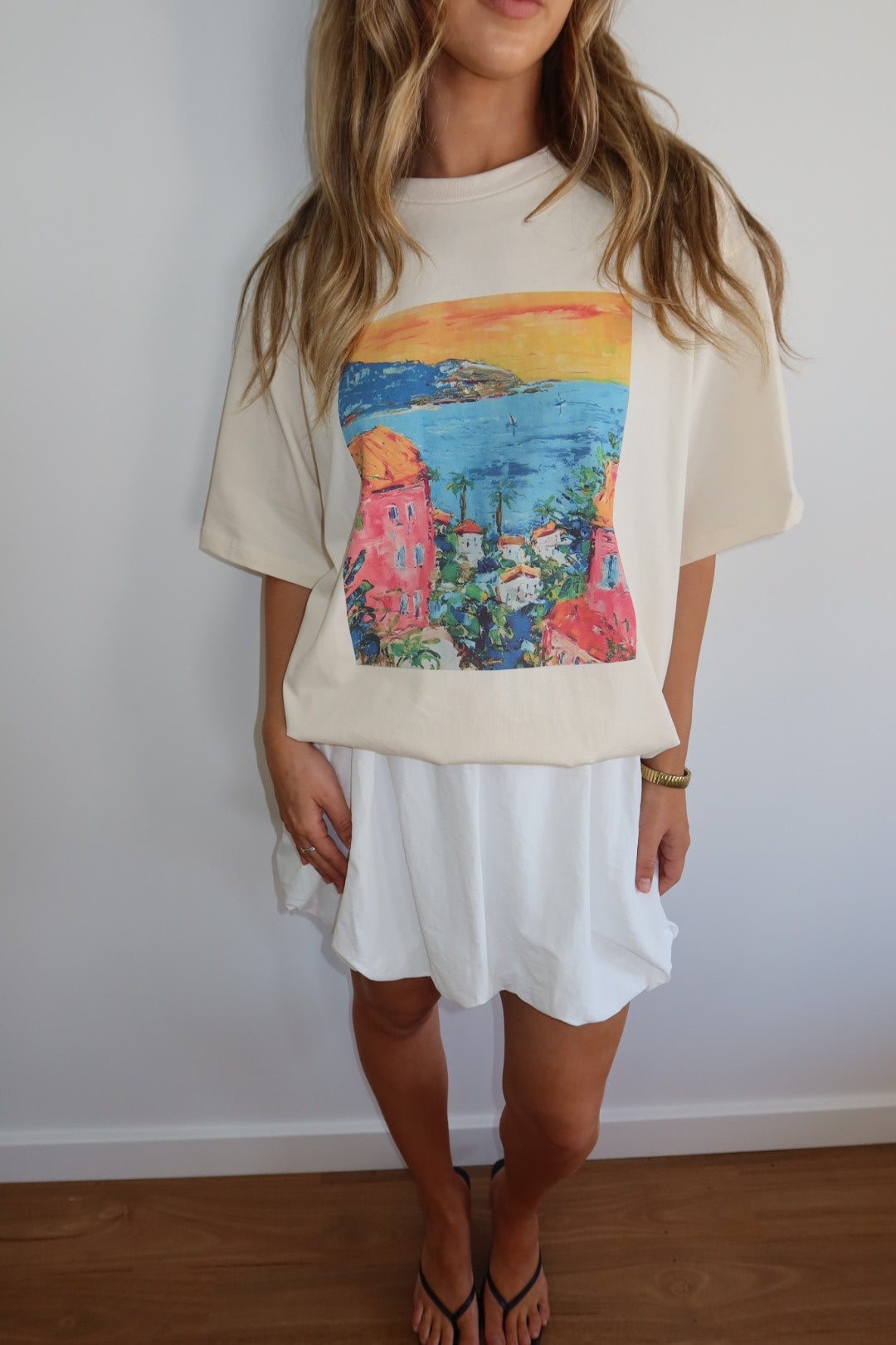 The Nova Tee – An oversized graphic tee with a bold patterned design. Made for relaxed, comfortable wear, it’s perfect styled with jeans, shorts, or skirts for an effortless, casual look.